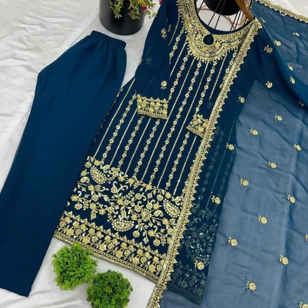 Royal Teal Pakistani Embroidered Georgette Three-Piece